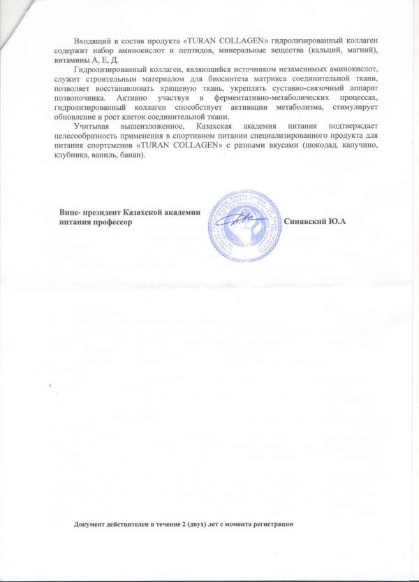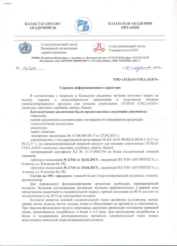 Наше предприятие с 2017 года начало выпуск Специализированного пищевого продукта для питания спортсменов «TURAN COLLAGEN»
